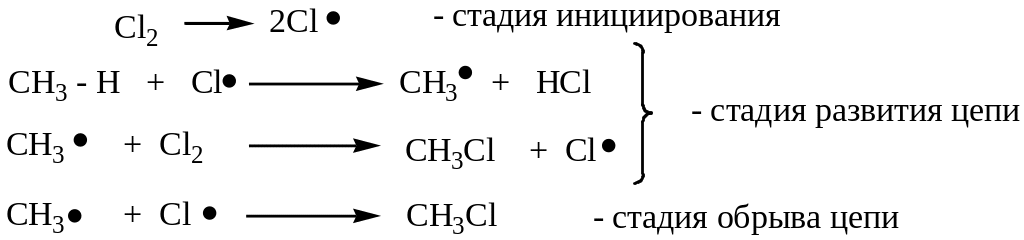 На свету или при нагревании молекула хлора распадается на два радикала, под действием которых происходит замещение атомов водорода.