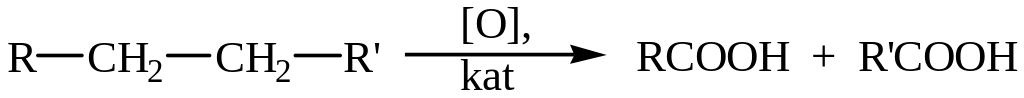 Кислород воздуха в присутствии катализаторов, а также некоторые окислители (KМnO4, K2Cr2O7 и др.) окисляют алканы при повышенных температурах с разрывом цепи и образованием органических кислот.