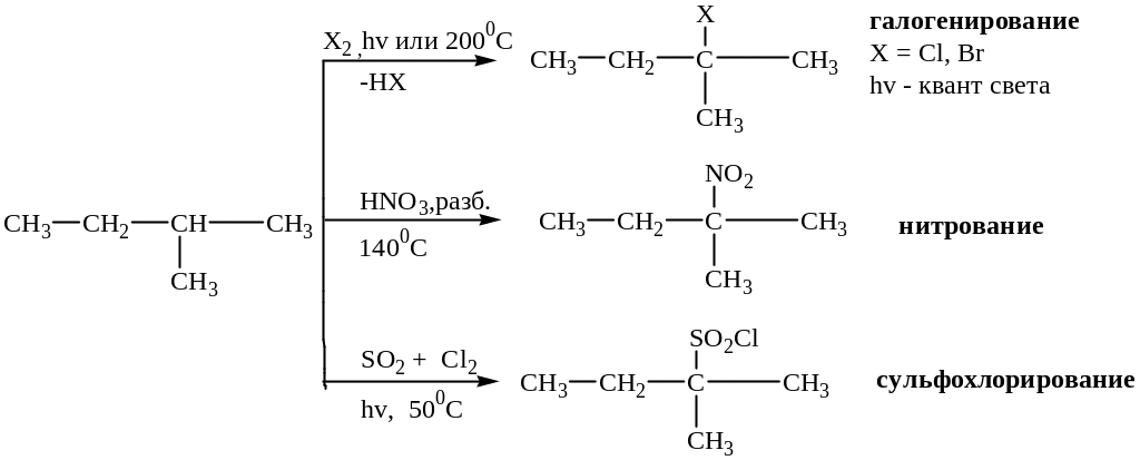Для алканов характерны реакции замещения и отщепления. Реакции замещения наиболее легко идут у третичного углеродного атома.