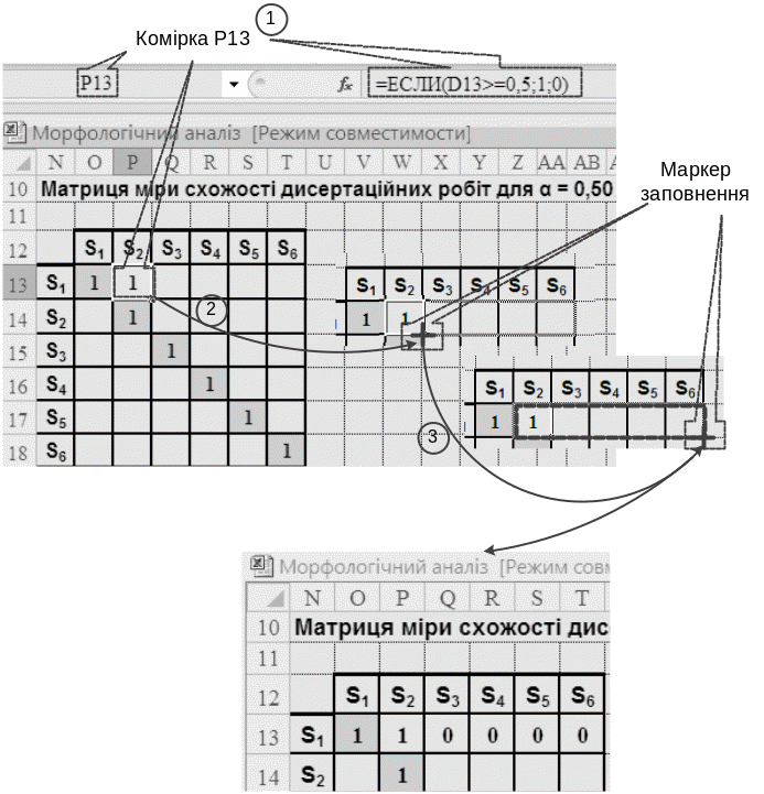 Рис. 17. Послідовність заповнення елементів матриці міри схожості для α = 0,50 у середовищі MS Office Excel