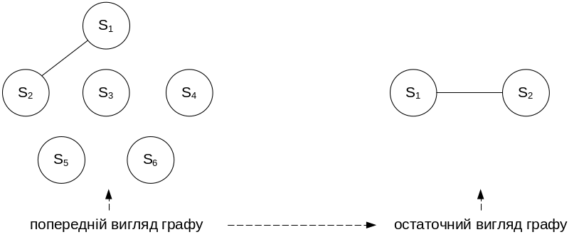 Для унаочнення дисертаційних робіт, що є найбільш схожими за напрямами наукових досліджень, на основі матриці міри схожості С1 побудуємо граф відношень схожості, вершинами якого є дисертаційні роботи. У такому графі поєднуються тільки ті вершини, для яких дисертаційні роботи у матриці С1 на пересіченні відповідних рядків і стовпців мають значення 1. У нашому випадку це є роботи S1 та S2 (див. табл. 8).