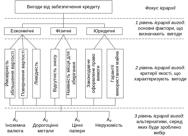 З огляду на види забезпечення кредитів, доцільно обрати такі альтернативи: А1 – іноземна валюта, А2 – дорогоцінні метали, А3 – цінні папери, А4 – нерухомість.