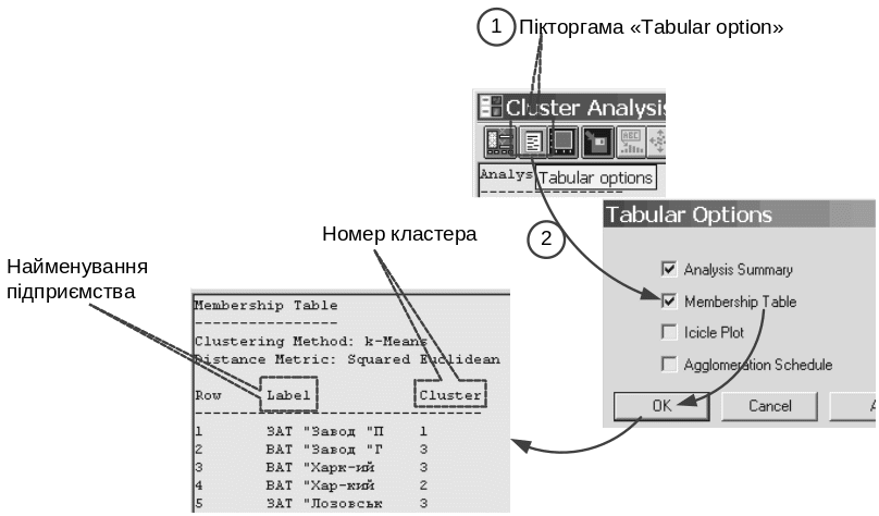 на панелі інструментів вікна кластерного аналізу виберіть піктограму Tabular options та у вікні, що відкриється (вікно Tabular Options), увімкніть маркер Membership Table (рис. 61);