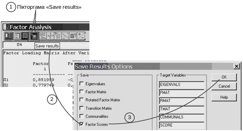 Рис. 58. Вікна опцій збереження результатів факторного аналізу