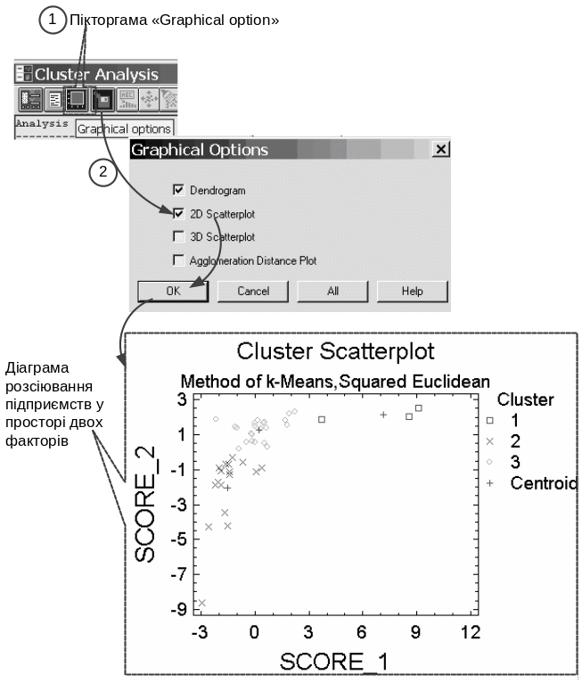 на панелі інструментів вікна кластерного аналізу виберіть піктограму Graphical option та у однойменному вікні, що відкриється увімкніть маркер 2D Scatter Plot (рис. 62);