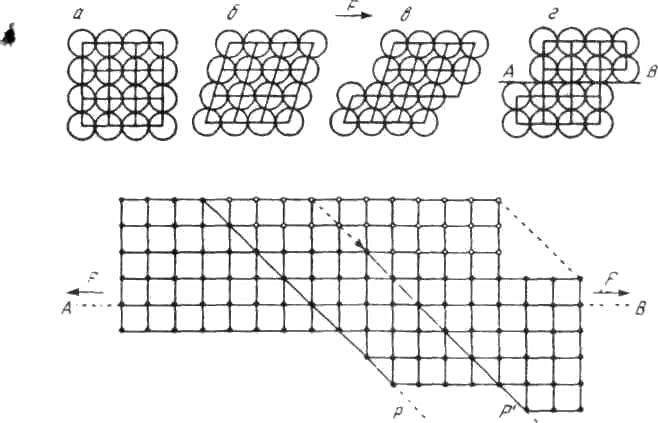 Для металлов характерно большее сопротивление растяжению или сжатию, чем сдвигу. Поэтому процесс пластической деформации обычно представляет собой процесс скольжения одной части кристалла относительно другой по кристаллографической плоскости или плоскостям скольжения с более плотной упаковкой атомов. Скольжение осуществляется в результате перемещения в кристалле дислокаций. В результате скольжения кристаллическое строение перемещающихся частей не меняется (рис. 2).