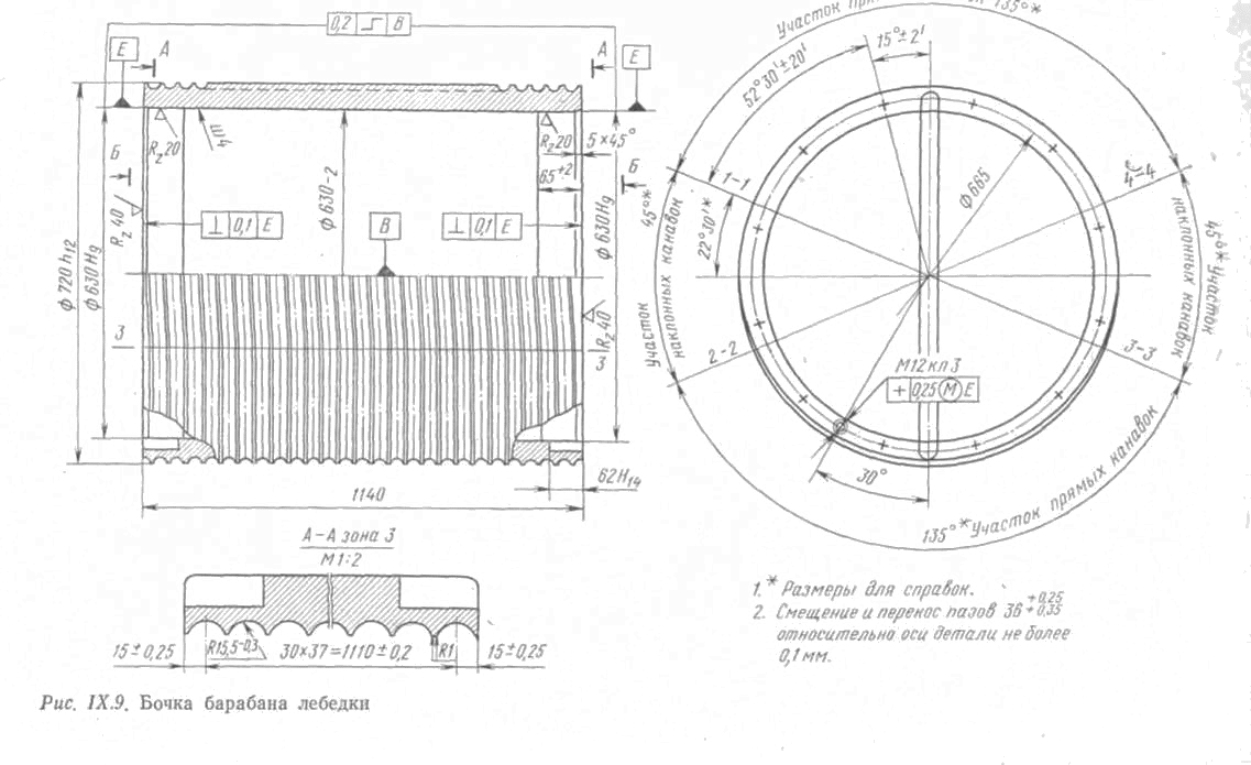 На рис.3 приведена конструкция бочки барабана подъемного вала. Для обеспечения правильной укладки на барабан на бочке следует сделать параллельные канавки. Переход из одной канавки в соседнюю в этом случае можно выполнить в виде ступенек с шагом, равным половине или полному шагу навивки каната.