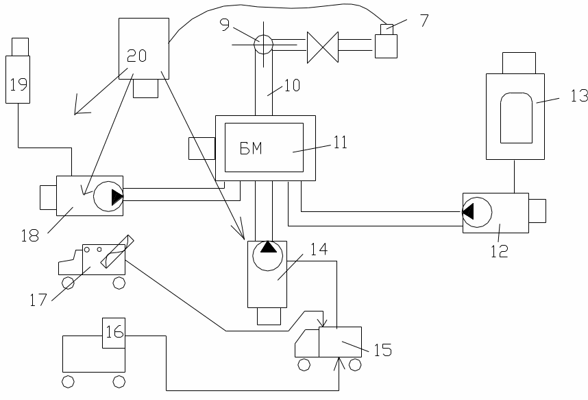 10-т/п высокого давления на быстроразъемных соединениях; 11- блок манифольд; 12,14,18 - мобильная насосная установка; 13,16,19 – автоцистерны; 15 – пескосмесительный агрегат; 17 – песковоз; 20 – станция управления.