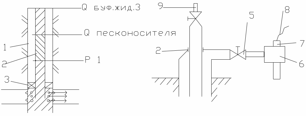1-ОК; 2- НКТ; 3- пакер; 4- оборудование устья; 5- боковая задвижка; 6- предохранит. клапан; 7- датчик давления; 8- кабель; 9-центральная стволовая задвижка и манифольд высокого давления.