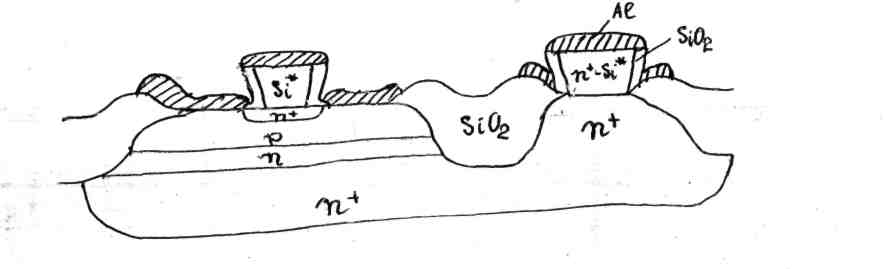 Некоторые варианты схемотехники быстродействующих БИС требуют высоких усилительных характеристик транзисторов, как в прямом, так и в инверсионном включении. Для таких случаев разработана транзисторная структура с симметричными характеристиками. Основой процесса является одновременное эпитаксиальное наращивание монокристаллического и поликристаллического слоев. В диэлектрике над областью скрытого n+-слоя вскрываются окна эмиттера и коллектора. Далее проводится наращивание кремниевого слоя р-типа, причем над областью диэлектрика осаждается поликристаллический слой. После обтравливания кремниевый слой окисляют, в окисле вскрывают контактные окна, проводят легирование эмиттера и контакта к базе и формирование металлизации ИС. Структура имеет очень маленькую емкость перехода коллектор-база, однако эпитаксиальная база препятствует получению высоких плотностей тока и достижению предельного быстродействия.