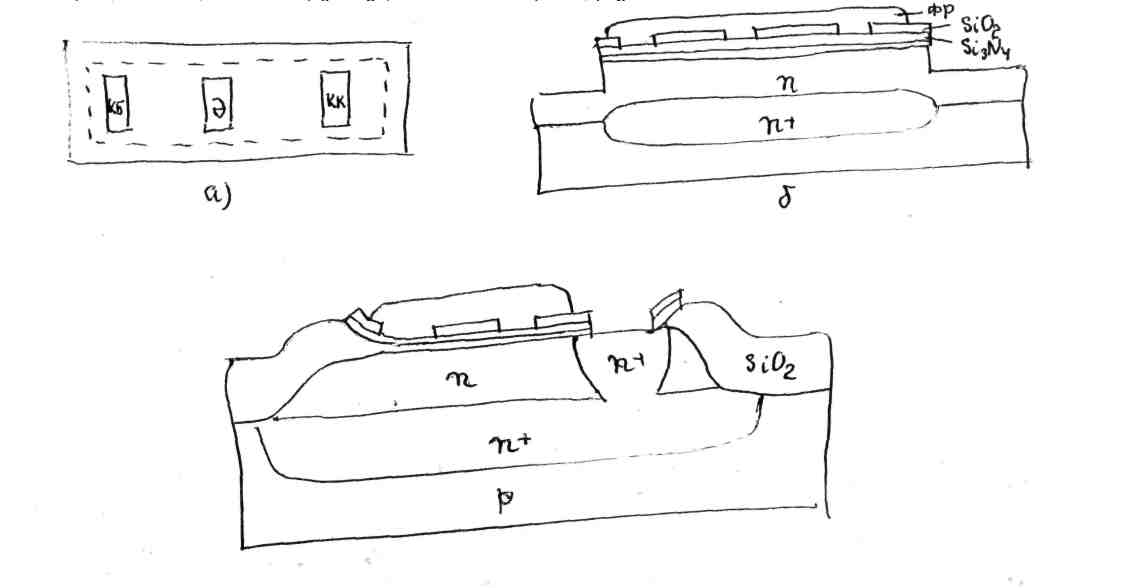 а) топология маски; б) использование маскирующих свойств окисла и фоторезистов для травления контура изоляции; в) вскрытие коллекторного контакта и легирование, области коллектора