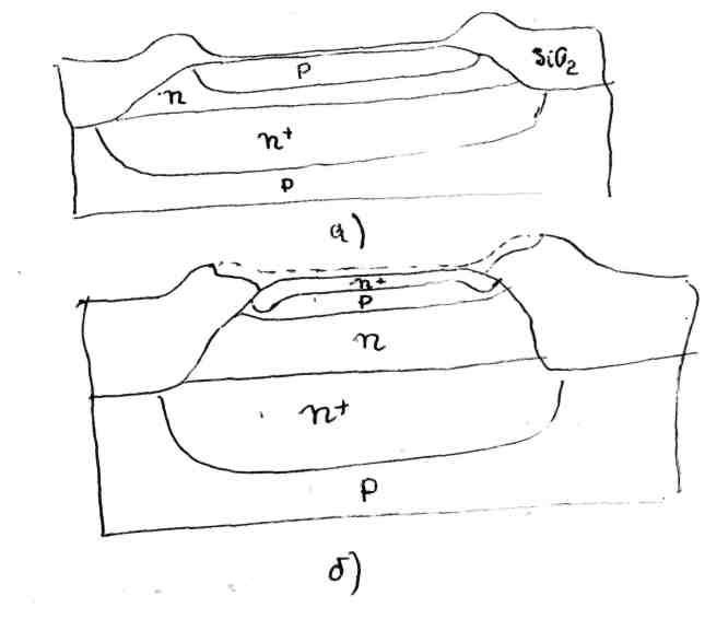 Рисунок 20.1 Самосовмещенное легирование эмиттера и базы в изопланарной структуре: а) ионное легирование база через слой тонкого окисла; б) сечение структуры с «пристеночным» эмиттером без дополнительного легирования активной области базы;
