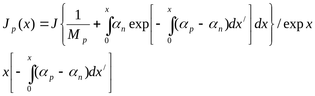 Найдем сначала основное выражение для условия пробоя. Пусть с левой стороны обедненной области шириной W втекает ток JРО. Если электрическое поле в обедненной области настолько велико, что вследствие ударной ионизации могут генерироваться электронно-дырочные пары, то дырочный ток JР будет нарастать с координатой и на правой границе обедненной области (=W) достигнет величины МрJPO. Аналогично электронный ток Jn будет возрастать в направлении от х=Wkx=0. Полный ток (J= JP+ Jn) в стационарных условиях постоянен. Приращение дырочного тока в точке с координатой х равно числу электронно-дырочных пар, генерируемых за 1 с на расстоянии dx: