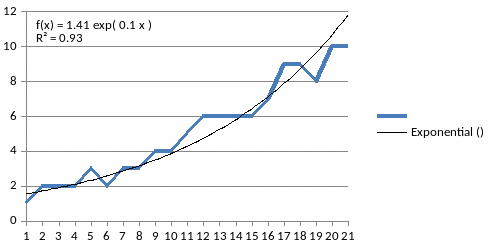Степенные тренды используются, когда данные плавно увеличиваются с нарастающей скоростью (данные не могут содержать нулевых или отрицательных значений) в соответствии с рисунком 3.
