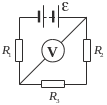 а рисунке R1=R2=R3=100 Ом. Вольтметр показывает (Uv=200 В, сопротивление вольтметра Rv=800 Ом. Определить ЭДС батареи, пренебрегая ее сопротивлением.