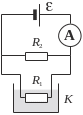 алориметр K имеет спираль, сопротивление которой R1=60 Ом. Спираль R1 включена в цепь, как показано на схеме рис.17. На сколько градусов нагреются 480 г воды, налитой в калориметр, за 5 мин пропускания тока, если амперметр показывает 6 А? Сопротивление R2=30 Ом. Сопротивлением генератора и амперметра и потерями тепла пренебречь.