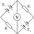 схеме на рисунке E1=E2, R2=2R1. Во сколько раз ток, текущий через вольтметр, больше тока, текущего через R2? Сопротивлением батарей пренебречь.