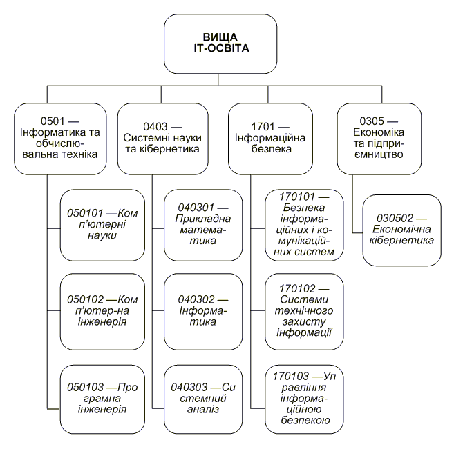 Розглянемо структуру вищої ІТ-освіти в Україні. Якщо за ознаку класифікації напрямів підготовка фахівців обрати вид економічної діяльності, зокрема, діяльність у сфері інформатизації, то виокремиться така їх підмножина, яку можна ідентифіку-вати як напрями підготовки ІТ-профілю. В Переліку-1997 їх три — “Математика і інформатика”, “Комп’ютерні науки” та “Комп’ютерна інженерія”. До вищої ІТ-освіти за обраною ознакою належить також спеціальність “Економічна кібернетика” з напряму “Економіка, комерція та підприємництво”. Перелік-2006 містить десять таких напрямів, розподілених між чотирма класифікаційними угрупуваннями “галузь знання”: 0501 — Інформатика і обчислювальна техніка, 0403 — Системні науки і кібернетика, 1701 — Інформаційна безпека, 0305 — Економіка і підприємництво (рисунок).