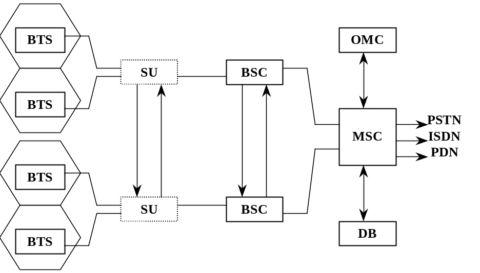 Схемы построения сетей различных стандартов в самых общих чертах напоминают одна другую. Во всех них, как это уже было показано выше, базовые станции, обслуживающие абонентские трубки в конкретной соте через контроллеры замыкаются на центры коммутации, а уже через последние осуществляется выход в различного типа внешние сети связи. Данная схема приведена на Рис. 2 .6. В ней использованы наиболее часто используемые английские аббревиатуры.