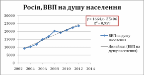 На рисунку 1.3 зображена динаміку рівня ВВП на душу населення для Росії протягом 2003 – 2012 рр і рівняння регресії для даного часового ряду має наступний вигляд: y = 1664х-3Е+06.