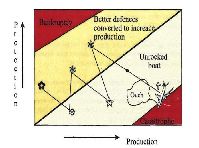 Инциденты имеют тенденцию приводить к срочным мерам по исправлению ошибок, но если в организации в течение длительного времени инцидентов не было, существует возможность снижения в ней расходов на безопасность. Ризон иллюстрирует это на Рис.35 «лодка на речном пороге»