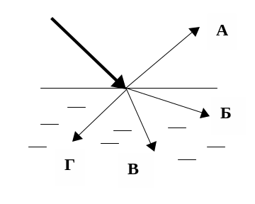 А3. Узкий световой пучок падает из воздуха на поверхность воды. Каким будет ход преломленного пучка света? Выберите правильный ответ и поясните ответ 1) A 2) Б 3) В 4) Г (1 балл) |