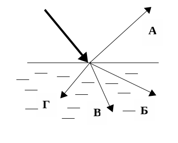 А3. Узкий световой пучок падает на границу вода-воздух, выходя из воды. Каким будет ход преломленного пучка света? Выберите правильный ответ и поясните ответ 1) A 2) Б 3) В 4) Г (1 балл) |