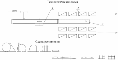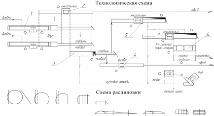 Рис. 4.3 б. Схема технологического процесса и схема раскроя при распиловке бревен на однопильных