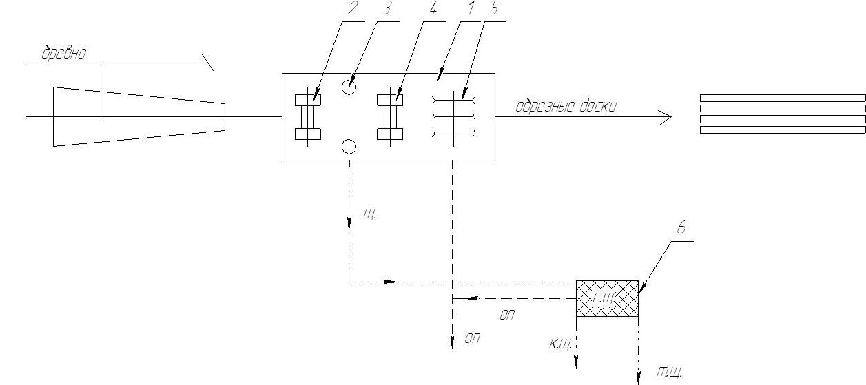 1 - фрезернопильный станок для выработки бруса; 2 - фрезернопильный станок для раскроя бруса;3 - торцовочный стол; 4 - сортировка щепы; 5 – фрезернообрезной станок.