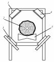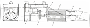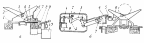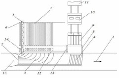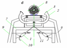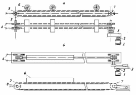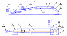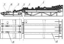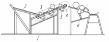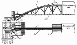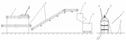 7 – сортировочный транспортер; 8 – карман накопитель; 9 – накопительная площадка с поперечным транспортером и механизмом поштучной выдачи бревен; 10 – продольный транспортер для подачи бревен в заводской бассейн