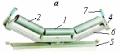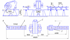 4 – консольно-козловой кран; 5 – подкрановый путь; 6 – приемные площадки с механизмами поштучной выдачей бревен; 7 – штабеля несортированного сырья;