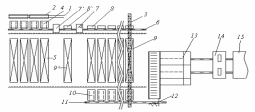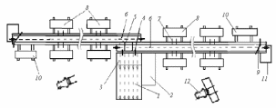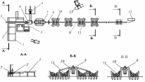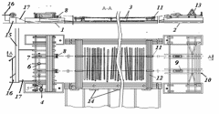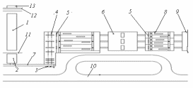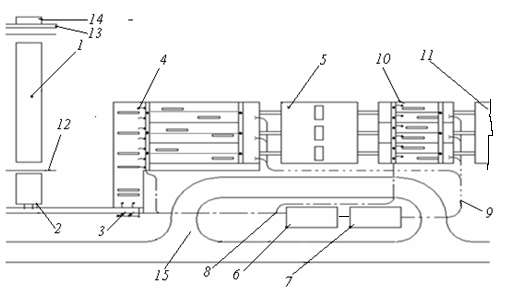 8 – сортировочный транспортер; 9 – дефектоскоп-металлоискатель; 10 – карман накопитель для некондиционного сырья; 11 – штабель для некондиционного сырья; 12 – пульт управления сортировочным транспортером; 13 – карманы-накопители рассортированных бревен; 14 – штабеля сортированных бревен;