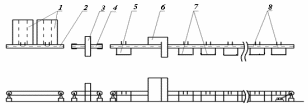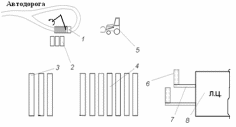 1 – лесовоз с краном; 2 – приемные площадки; 3 – штабеля несортированного сырья; 4 – штабеля с рассортированными бревнами; 5 – трактор “Беларус” с челюстным захватом; 6 – поперечный транспортер; 7 – бревнотаски; 8 – лесопильный цех