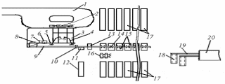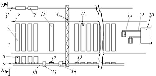 1 – автодорога с разворотным кольцом; 2 – лесовоз для хлыстов; 3 – разгрузочно-раскряжевочная установка; 4 – манипуляторы для поштучной выдачи хлыстов; 5 – продольный цепной транспортер; 6 – пуль управления раскряжевкой хлыстов; 7 – пила для раскряжевки хлыстов; 8 – бревносбрасыватель; 9 – сортировочный транспортер с сортировкой бревен на обе стороны; 10 – дефектоскоп-металлоискатель; 11 – карман накопитель для некондиционного сырья; 12 – штабель некондиционного сырья; 13 – пульт управления сортировочным транспортером; 14 –. двухсторонние сбрасыватели бревен; 15 – двухсторонние карманы накопители для рассортированных бревен; 16 – лесопогрузчик с челюстным захватом; 17 – штабеля рассортированных бревен; 18 – приемные площадки с поперечными цепными транспортерами и механизмами поштучной выдачи бревен; 19 – бревнотаски для подачи бревен в лесопильный цех; 20 – лесопильный цех