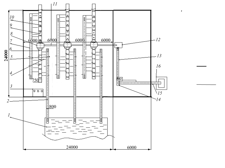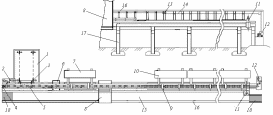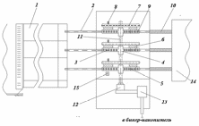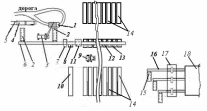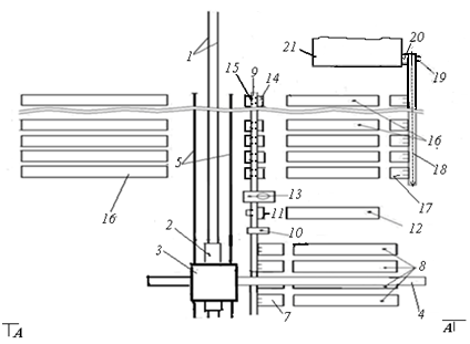 5 – подкрановый путь; 6 – грейфер; 7 – приемные площадки с механизмом поштучной выдачей бревен; 8 – штабеля несортированных бревен; 9 – двухсторонний сортировочный транспортер; 10 – дефектоскоп-металлоискатель; 11 - карман–накопитель для некондиционного сырья; 12 – штабель для некондиционного сырья; 13 – пульт управления сортировочным транспортером; 14 –. двухсторонние карманы накопители для рассортированных бревен; 15 – двухсторонние сбрасыватели бревен; 16 – штабеля рассортированных бревен; 17 – буферные площадки с поперечным транспортером и механизмом поштучной выдачи бревен; 18 – продольный транспортер; 19 – бревносбрасыватель; 20 – поперечный транспортер для передачи бревен в бассейн; 21 – бассейн