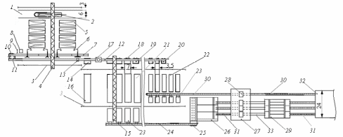 1 – дорога для доставки хлыстов; 2 – автолесовоз; 3 – подкрановый путь; 4 – кран для разгрузки хлыстов ЛТ-62; 5 – место складирования хлыстов; 6 – манипуляторы; 7 – продольный двухцепной транспортер; 8 – пульт управления разделкой хлыстов; 9 –балансирный торцовочный станок; 10 – сбрасыватель сортиментов; 11 – перечный транспортер с механизмом поштучной выдачи; 12 –сортировочный транспортер; 13 – дефектоскоп-металлоискатель; 14 – карман накопитель для некондиционного сырья; 15 – консольно-козловой кран;16 – штабель некондиционного сырья; 17 – пульт управления сортировкой сырья; 18 – сбрасыватели бревен; 19 – карманы накопители для хвойных и мягких лиственных пород; 20 – карманы накопители для твердолиственных пород; 21 – штабеля рассортированных бревен хвойных и мягких лиственных пород; 22 – штабеля рассортированных бревен твердых лиственных пород; 23 – накопительная площадка с механизмом поштучной выдачи бревен; 24 – продольный цепной транспортер; 25 – рычажный сбрасыватели бревен; 26 – бассейн для оттаивания бревен; 27 – окорочный цех; 28 – окорочные станки; 29 – заводской бассейн для подсортировки бревен; 30 – транспортеры для подачи твердолиственного сырья в лесопильный цех минуя бассейны; 31 – бревнотаски; 32 – лесопильный цех; 33 – спусковой лоток для подачи окоренных бревен в бассейн перед лесопильным цехом