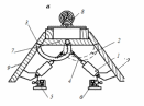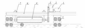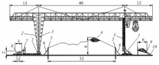 1 – подкрановый путь; 2 – кран; 3 – опоры крана;4 – штабель рассортированных бревен; 5 – ограничитольная стойка штабеля; 6 – подпорки стоек штабеля;