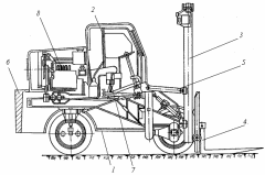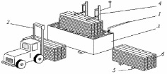 1 – подставка под пакет для захвата лесовозом; 2 – подъемные винты; 3 – привод подъема платформы; 4 – формируемый пакет пиломатериалов; 5 –плотный пакет пиломатериалов