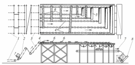 1 – подающий поперечный транспортер; 2 – наклонный подъемник для разборки пакета досок; 3 – транспортер для подачи досок по одной; 4 – поперечный транспортер с цепями разных длин; 5 – люки; 6 – доски; 7 – транспортер; 8 – лифт для формирования пакета