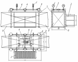 Рис. 5.72. Захват для пакета пиломатериалов: 1 – блоки; 2 – площадка для рабочего; 3 – электродвигатель, 4 – червячный редуктор; 5 – вал поперечный; 6 – валы продольные; 7 – стойки поворотных захватов; 8 – поворотные захваты; 9 - пакет пиломатериалов