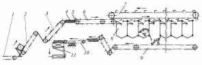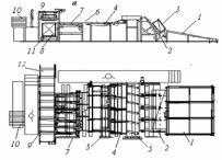 1 – подающий поперечный транспортер; 2 – наклонный подъемник для разборки пакета досок; 3 – транспортер для поштучной подачи досок; 4 – роликовый транспортер для выравнивания торцов досок; 5 – механизм поштучной подачи досок на транспортер; 6, – поперечный транспортер с пультом управления; 7 – сортировочный транспортер; 8 – накопители для досок; 9 – поперечный транспортер для перемещения досок; 10 – пакетоформировочное устройство; 11 – лифт для формирования транспортного пакета