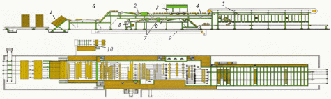 1 – место разборки сушильных пакетов; 2 – участок браковки досок перед торцовкой комля; 3 – кабина операторов; 4 – участок торцовки досок в размер; 5 – участок сортировки; 6 – участок разобщения досок по одной; 7 – маркировочные установки; 8 – место формирования транспортных пакетов; 9 – система транспортеров для сбора и выноса отходов; 10 – место выноса и сбора сушильных прокладок