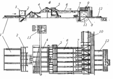 6 – место для прокладок; 7 – вагонетка для бракованных досок; 8–подъемный лифт; 9 – рельсы
