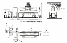 1 – бак для приготовления концентрированного раствора; 2 – бак для рабочего раствора; 3 – расходный бак; 4 – бак для перекачки раствора; 5 – ванна с пакетом; 6 – отстойный колодец; 7 – монорельсовая тележка