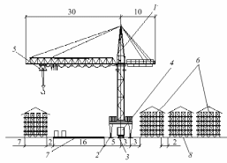 Формирование штабелей может, осуществляется кранами различного типа: башенными, консольно-козловыми, автомобильными и другими. Наиболее приемлемыми с точки зрения производительности и удобства формирования штабелей являются башенные краны с порталом, рис. 5.5, 5.6 с горизонтальной стрелой вылетом 30 м типа БКСМ-14ПМ, КБ-572, КБ-578 и др., табл. 3 прил. В портале крана может размещаться железнодорожный путь или автодорога. Кран, находясь на месте, может обслужить участок склада в радиусе 30м.