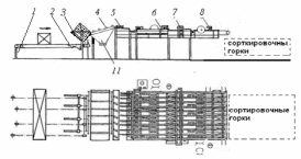 1 – место разборки сушильных штабелей с наклонным лифтом; 2 – участок разборки досок по одной; 3 – операторы торцовки комлей досок; 4 – установка для торцовки комлевой части досок; 5 – сортировочные подъемники; 6 – кабины операторов; 7 – установка для торцовки досок в размер; 8 – сортировочные карманы с опускающимся днищем; 9 – участок маркировки торцов досок; 10 – пакетирующая установка с обжимом, увязкой и защитой досок от влаги; 11 – система транспортеров для сбора и удаления мусора и отходов
