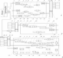 Условные обозначения к рис 6.1: а) производство заготовок, фризы и паркета; б) производство строганых погонажных изделий; в) производство стройдеталей;1 – рельсовые пути; 2 – пакет сырых пиломатериалов; 3 – установка для формирования сушильных пакетов; 4 – торцовочный станок; 5 – приводной рольганг с упором; 6 – поперечный конвейер; 7 – станок для раскроя отрезков по ширине; 8 – торцовочный станок с подвижной кареткой; 9 – пакет черновых заготовок (фриза); 10 – траверсный путь; 11 – сушилки;