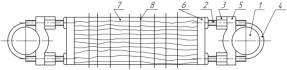 1 – стойка пильной рамки; 2 – болт струбцины;3 – натяжная гайка; 4 – хомут крепления струбцины;5 – основание струбцины; 6 – уголок для удержания прокладки;7 – межпильные прокладки; 8 – пилы.