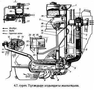 Қылта аузын тығынмен жауып қозғалтқышты жылытуды жалғастырады. Қыздырылған су түтікжетек 10 және жалғастырғыш түтіктер 11 мен 13 арқылы цилиндрлер қатарының оң және сол жағының салқындату сұйықтығының тысына жіберіледі, олады жылытып конденсат күйінде қайтадан түтікжетек 7 арқылы қазанға қайтадан келтіріледі. Қазаннан шығарылған газдармен жалғастырғыш түтік 9 арқылы бағыттап картердегі майды қыздыруға қолданылады. Қозғалтқышты жылытқаннан кейін оталдырғыш қол тұтқамен иіндібілікті бірнеше рет айналдырып майлағыш материалды подшипниктерге жеткізеді. Иіндібіліктің еркін айналуы қозғалтқыштың оталдыруға дайын болғанын білдіреді. Ажыратқыштың 25 тұтқасы барынша енгізіліп тұрса, онда жылытқыш жұмыс істемейді, егер де жартылай шығарылып тұрса, онда желдеткіштің 2 электрлідвигателі іске қосылады, ал егер ажыратқыштың тұтқасы барынша шығарылып тұрса, онда қосымша электрлімагнитті клапан іске қосылады. Температураның – 25оС төмен болса жылытқыш қозғалтқышты 15–20 мин. аралығында жылытып үлгереді. Жылытқыштың жұмысын тоқтату үшін, ажыратқышпен 25 электрлімагнитті клапанды іске қосып, бачоктың 19 кранын жабады, 1–2 минуттан соң желдеткішті тоқтату керек. Егер салқындату жүйесінде салқындатқыш сұйықтығы құйылған болса, онда жылытқышты іске қоспастан бұрын сұйықтықтың қою массаға айналмағанын білу керек және қозғалтқышты тұтандыру алдында салқындатқыш сұйықтығын пайдалануда, шығарған заводтың нұсқаулығы қатаң сақталуы керек.