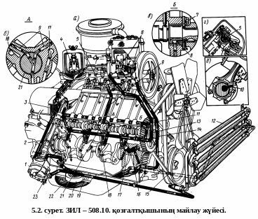 ЗиЛ – 508.10 қозғалтқышының майлау жүйесі. Бұл қозғалтқыштың майлау жүйесінде майды картерден 22 май қабылдағыш 20 арқылы май сорабының жоғарғы секциясы 1 сорып алып, май каналмен 2 ортадан тепкіш май сүзгісіне 4 (центрифуга) беріледі.